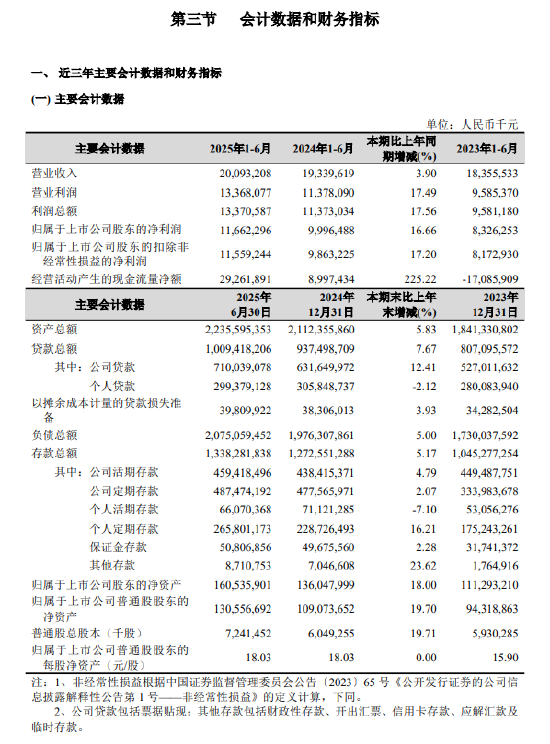8月27日金融一线消息,杭州银行公告,2025年上半年公司实现营业收入 200.93 亿元,同比增长3.90%,其中利息净收入 130.90 亿元,同比增长 9.38%;实现归属于公司股东净利润 116.62 亿元,同比增长16.66%;基本每股收益(未年化)1.75 元,同比增长 6.71%,归属于公司普通股股东的加权平均净资产收益率(未年化)9.50%,同比下降 0.24 个百分点。