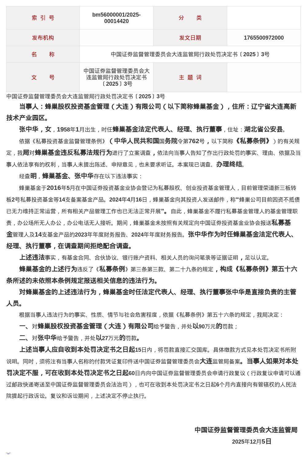针对以上问题,中国证券监督管理委员会大连监管局决定对蜂巢股权投资基金管理(大连)有限公司给予警告,并处以90万元罚款;对张中华给予警告,并处以27万元罚款。